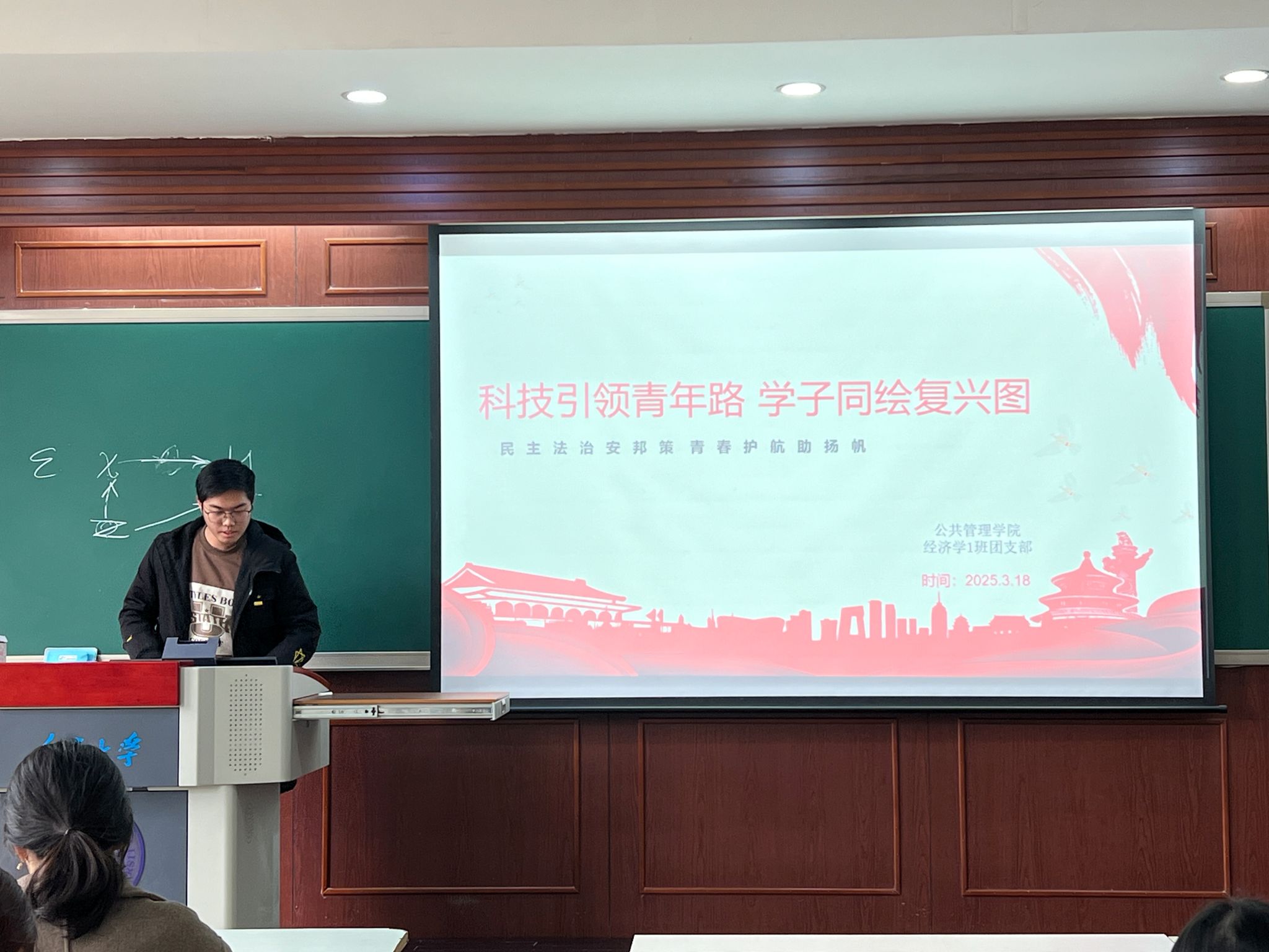2022级经济学1班团支部在第五教学楼308教室内召开了“科技引领青年路 学子同绘复兴图”主题团日活动。本次团日活动由2022级经济学1班团支部书记黎豪主持,2022级经济学1班全体成员积极参与。