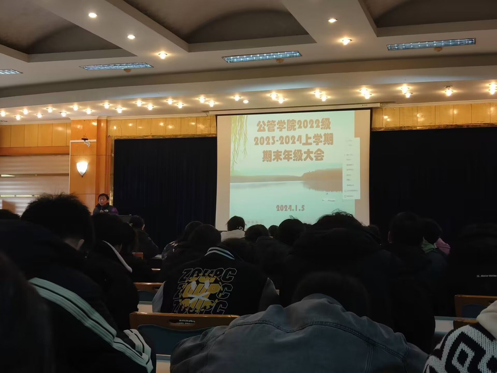 2022级2023-2024第一学期期末年级大会在学院楼202顺利召开。本次大会由学办主任兼22级辅导员王丽娟主持,22级全体同学参与了本次年级大会。