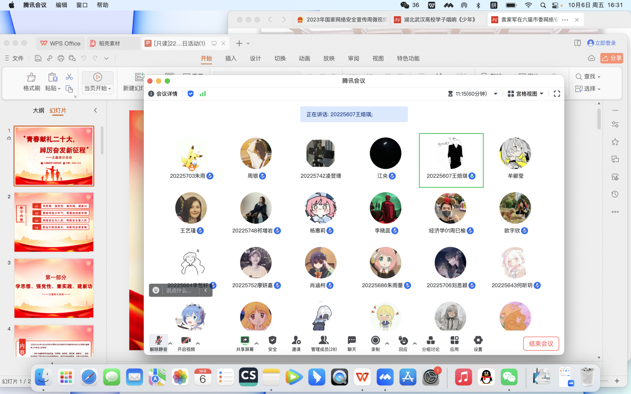团日的第三个议题是“网络安全为人民,网络安全靠人民”,开展网络知识学习。首先以PPT形式介绍了“网络安全是什么”“网络安全为何重要”,接着选播了2023年国家网络安全宣传周微视频。在此基础上,一起学习了习近平总书记相关重要论述,同学们深刻体悟了习近平总书记关于坚决打破“安全孤岛”,很多技术都是“双刃剑”,做到魔高一尺、道高一丈等论述的深刻内涵。还观看了袁家军书记参加网络安全会议的在新闻视频。随后同学们进行讨论,王焙琪同学作交流发言。同学们一致表示,要牢记习近平总书记的谆谆教诲,在头脑中真正筑起网络安全的“防火墙”。