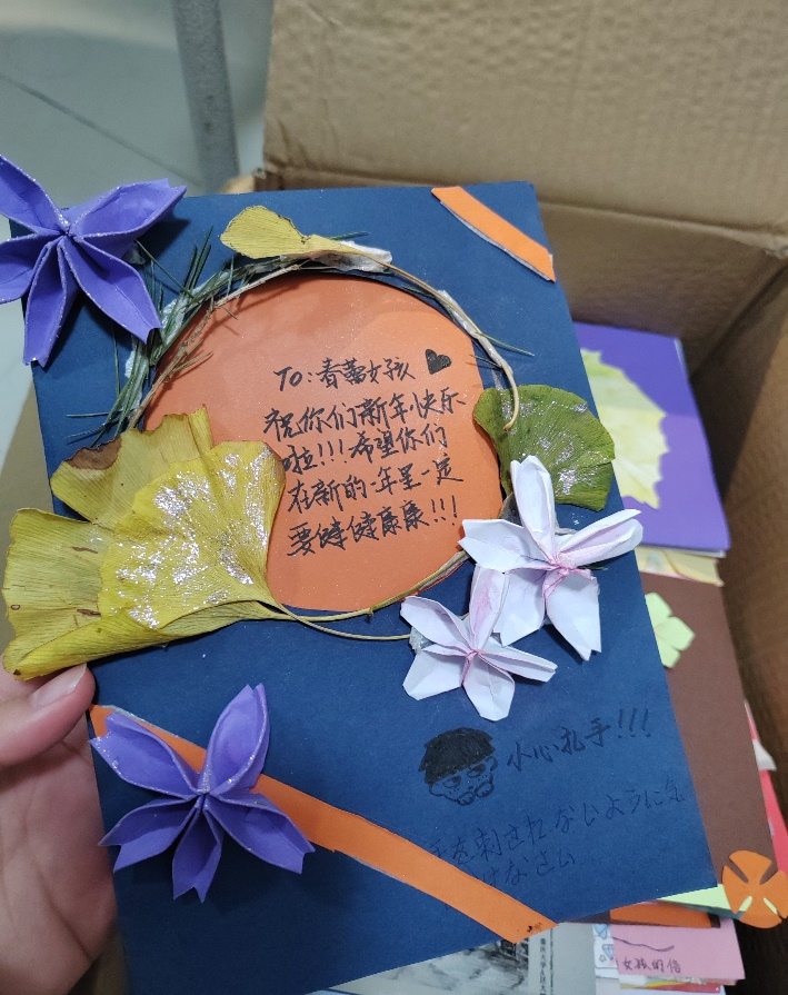 大家把自己对春蕾女孩们的关心和祝福,写在一张张精美的卡纸上,把内心