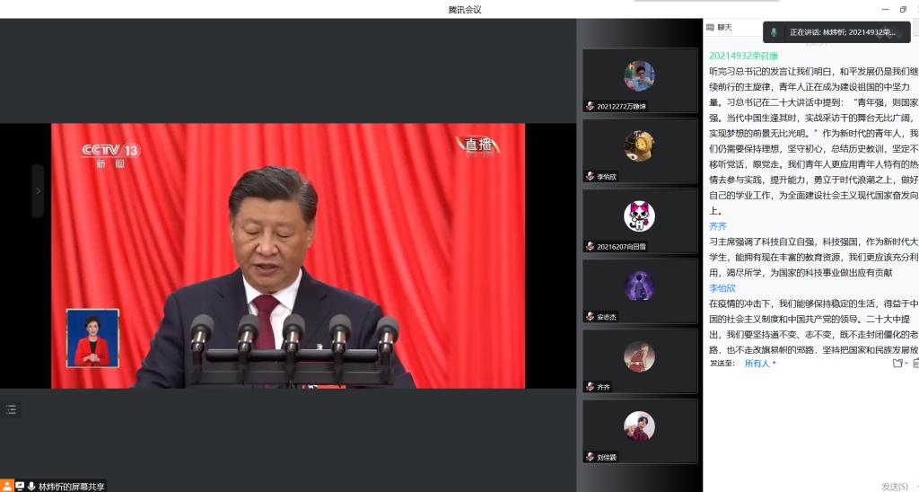 首先,向阳爱心社社长林炜忻组织社员第一时间观看了党的二十大开幕会直播,聆听习近平总书记代表第十九届中央委员会向党的二十大作报告。观看党的二十大开幕会后,社员们对党的二十大报告重点内容、核心精神展开了积极的讨论分享。林炜忻同学表示:新时代十年来,党和国家事业取得历史性成就,发生历史性变革,取得了举世瞩目的重大成就,我们应全面贯彻新时代中国特色社会主义思想,自信自强、守正创新、踔厉奋发、勇毅前行。向阳爱心社团支书荣召康深切领悟到,作为新时代的青年人,我们仍需保持理想,坚守初心,总结历史教训,坚定不移听党话,跟党走,以青年人特有的热情参与实践,提升能力。社员向田雪也认同这一观点,并补充:我们广大青年要立志做有理想、敢担当、能吃苦、肯奋斗的新时代好青年,让青春在全面建设社会主义现代化国家的火热实践中绽放绚丽之花。社员李怡欣从中国的疫情防控角度出发,认为在疫情的冲击下,我们能够保持稳定的生活得益于中国特色社会主义制度的优越性和中国共产党的集中领导。向阳爱心社其他成员也纷纷发表自己的看法,会议讨论氛围激烈热情。