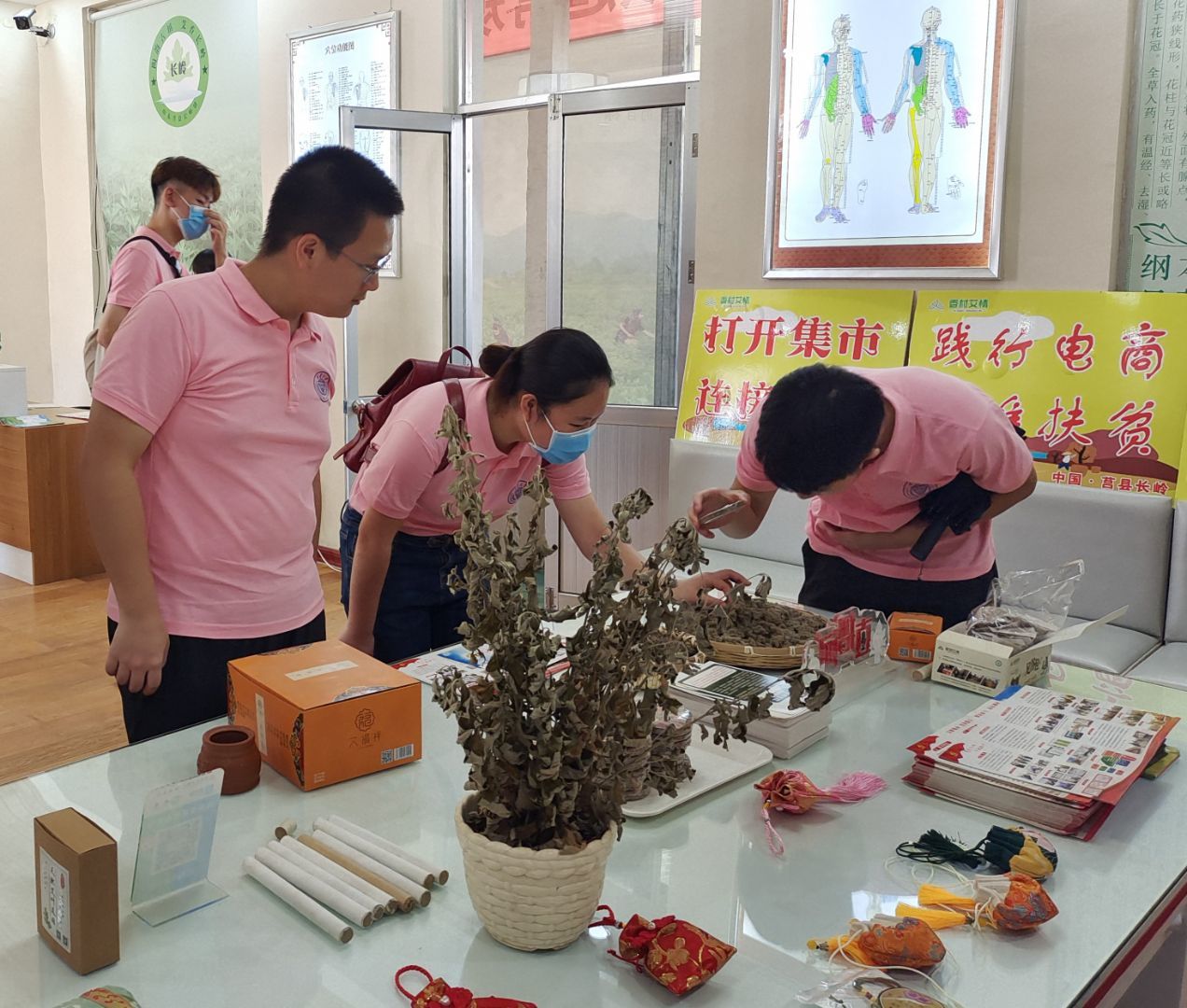 随后,团队成员转场至艾草产销基地,学习当地艾草产业的发展历史、加工产品以及销售渠道等。经过镇长的介绍,我门了解到,面对村集体资源少、集体积累少的现状,该村书记及支部班子不等不靠,成功抓住了全市首届文化旅游美食节的机遇,获得了不俗的反响,推动向“土地”要收入到向“农产品”要收入的转变。如今,从艾草种植地、加工车间、艾产品展厅再到艾灸体验馆,长岭镇的艾草产业已经实现生产、加工、销售一体化的产业链。长岭镇艾草的发展故事拓宽了同学们的视野,为同学们调研学习乡村振兴提供了优秀的案例。
