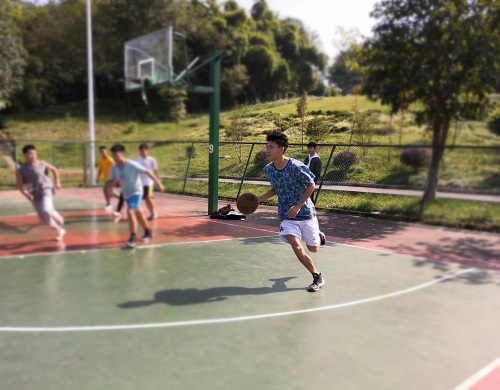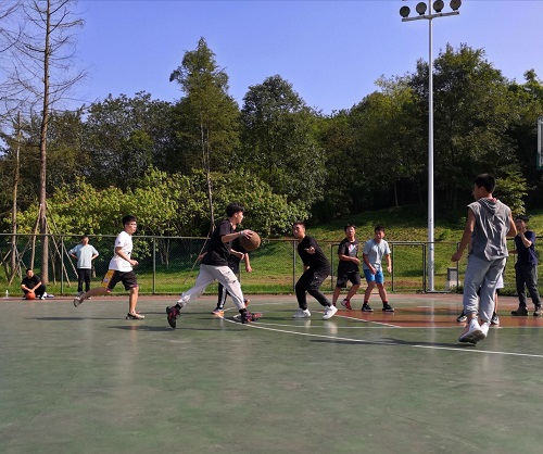 10月29日中午,天公作美,晴空万里,太阳暖融融地照在同学们的身上,为凉爽的秋天带来暖意。当裁判员的哨声响起,四场比赛同时开始。发球、运球、传球、断球……双方运动员在场上展开激烈地争夺,场上的气氛突然紧张起来。与此同时,观战的同学们也自发组织起来,纷纷为本队球员加油助威,篮球场上人声鼎沸,呐喊声不绝于耳。双方球员在球场上尽情地奔跑,抢过对方手中的球后,一个转身,将球直投入篮,上半场的比赛在同学们的阵阵欢呼声中结束。