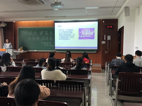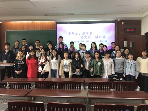 2018年3月29日下午两点,为了让同学们心系两会动向、了解当下国家的发展变化及发展方向、学习两会精神,根据校团委的部署和公管虎溪本科支部以“党建带团建”的计划安排,学院2016级、2017级各班团支部于第一教学楼举办以“学两会、谈家乡、讲变化、话未来”为主题的团日活动。全体同学积极参与,共论两会热点,分享心得体会。