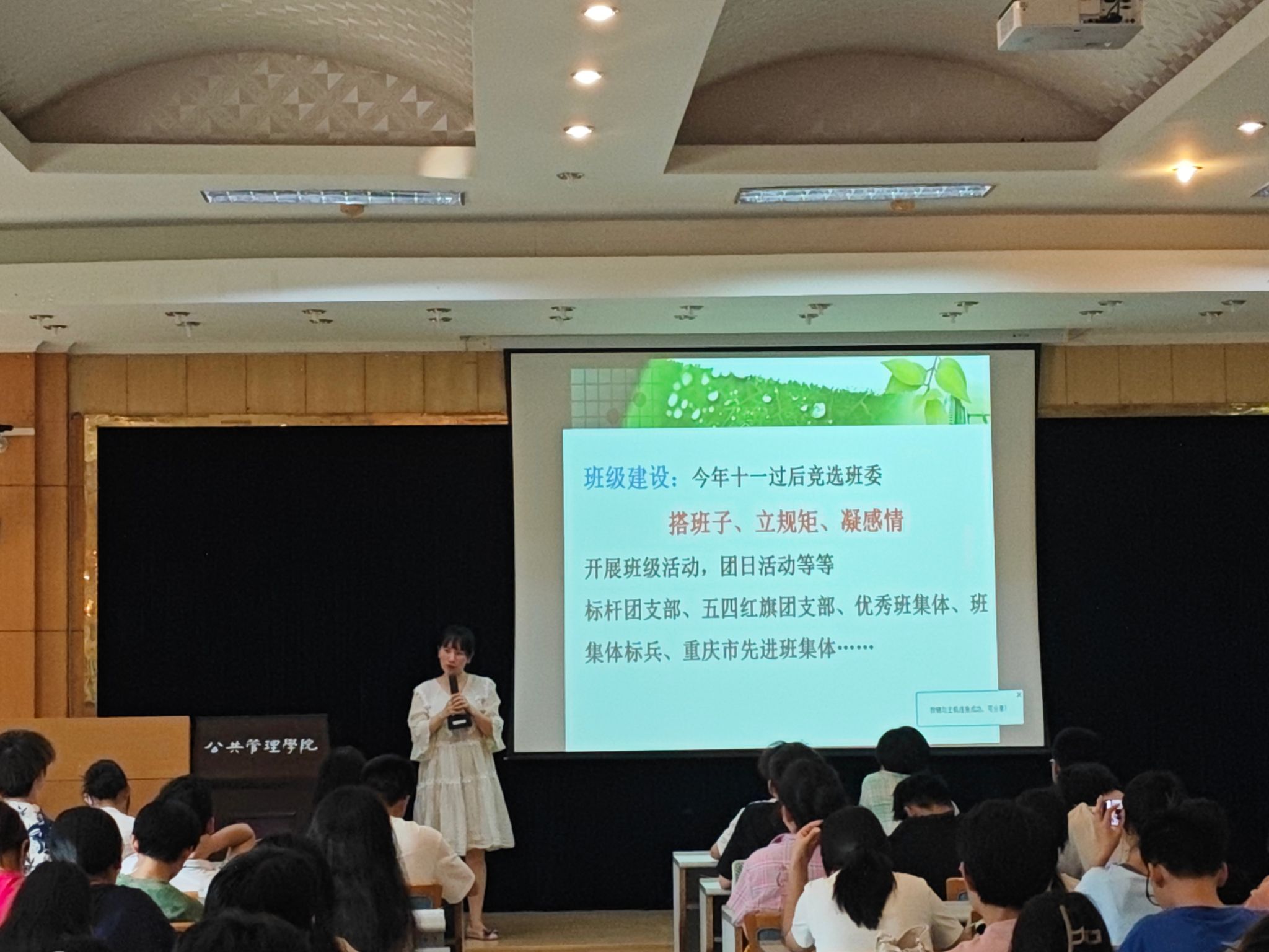 本次大会是暑假后对同学们进行收心教育以及对本学期重点工作的安排和部署,徐老师围绕树立优良的班风学分、搭建积极向上的班团组织和拓展全面发展的个人三方面来展开。