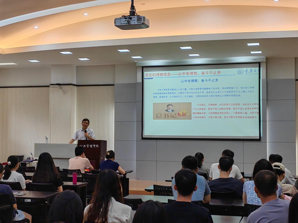 本科生五支部的支部书记同志也在会议上发表了临别赠言,她鼓励同志们,在未来的生活中,面对无处不在的内卷压力,要坚持学习,不忘初心,健康的工作和生活。会议的最后,在徐老师的带领下,全体党员一同起立,再次举起右拳,重温入党誓词,在同志们铿锵有力的宣誓声中,此次党课圆满结束。