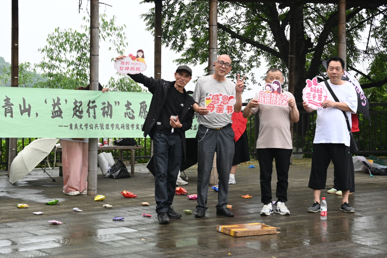 二组负责垃圾置换和母亲节Kt板拍照打卡活动。9名志愿者在山底布置置换和打卡活动现场,通过白色垃圾置换套圈等游戏方式,号召游客关注景区卫生环境;kt板“母亲节”打卡区吸引了众多家庭的目光,志愿者们鼓励参与者与Kt板合影,分享他们的母亲节故事以及对母亲的感谢留言,并转发照片到朋友圈。这些故事里的记忆和贴心的话语成为了母亲节最温馨的礼物,也让在场的母亲们感受到了家人的爱与尊重。活动结束后,学生志愿者积极交流,总结活动经验。