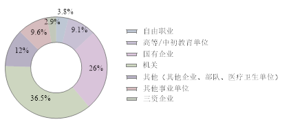 就业单位以国有企业为主体,去往国有企业共43人,占比44%,集中在建筑业、金融业,其次为交通运输业;其次是其他企业(民营等),共35人,占比36%,主要分布在房地产业和教育业,其次为批发零售业,信息传输业、制造业和租赁服务业;三资企业有4人,在房地产业、批发零售业和信息传输业;机关单位有5人,为选调生或普通公务员;其他事业单位2人,是文化体育行业教学人员和部队人员;另有自由职业和自主创业9人,主要从事写作方面工作。