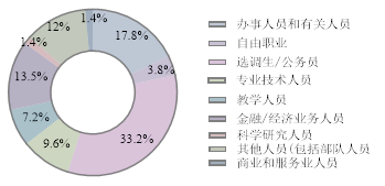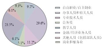硕士毕业生以选调生或公务员居多,共69人,占就业总数的33%,其中90%都在重庆市;金融/经济业务人员28人,占比14%,都在金融业和房地产业;专业技术人员为20人,占比10%,主要在交通运输业和信息传输业,零散分布在建筑业和制造业等;担任教学人员共有15人,其中10人都在高等教育单位,4人在中初教育单位,剩下1人在其他事业单位;办事人员和有关人员共37人,占比18%,主要在公共管理社会保障组织中,其次主要分布在交通运输业、信息传输业和居民服务维修业;另有3人在房地产业和交通运输业中从事商业和服务业人员;科学研究人员3人;其他人员共25人,包括2人进入部队单位,主要在公共管理社会保障组织和交通运输业;另有自由职业者8人,6人从事自由撰稿,2人进入零售行业。