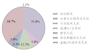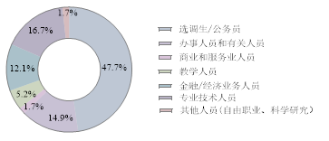 硕士毕业生有近一半都在公共管理、社会保障和社会组织中,以选调生或公务员居多,共83人,占就业总数的48%,其中的82%集中在重庆市;金融/经济业务人员21人,占比12%,基本都在金融业和房地产业;专业技术人员为29人,占比17%,分布在房地产业、建筑业、交通运输业等;担任教学人员共有9人,有3人在高等教育机构,4人在中初教育单位,剩下2人在教育培训机构;办事人员和有关人员共26人,占比15%,广泛分布于公共管理社会保障组织、房地产业、制造业等等;另有3人从事商业和服务业人员,都进入房地产行业。