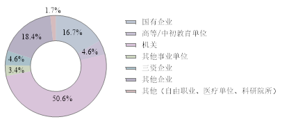 硕士毕业生一半在政府机关单位,共88人,占比51%;进入其他事业单位的共6人,占比3%,基本都是在公共管理、社会保障和社会组织中;国有企业共29人,占比17%,主要在电气水供应业、交通运输和金融业;三资企业共8人,都在房地产和制造业;其他企业(如民营)共32人,主要是在房地产业;进入高等教育单位的有4人,中初教育单位4人;其余则为医疗卫生单位、科研设计单位和自由职业3人。