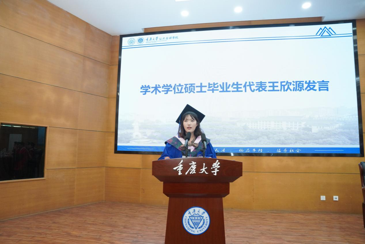 学术学位硕士毕业生代表王欣源发言,她相信2025届毕业生一定会牢记“耐劳苦,尚简朴,勤学业,爱国家”的校训,胸怀远志、手握蓝图,昂扬思想、踏实脚步,将谱写“百年新重大”崭新篇章作为重大公管人光荣的使命,让“尚道至公,管泽天下”的精神成为重大公管人闪耀的光环。