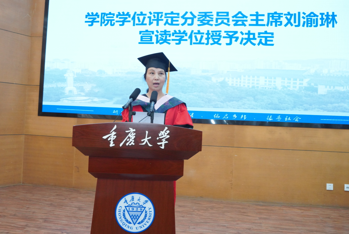 学位评定分委员会主席刘渝琳宣读学位授予决定,全场共同鼓掌祝贺348名获得学位、顺利毕业的同学。