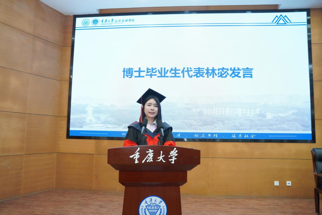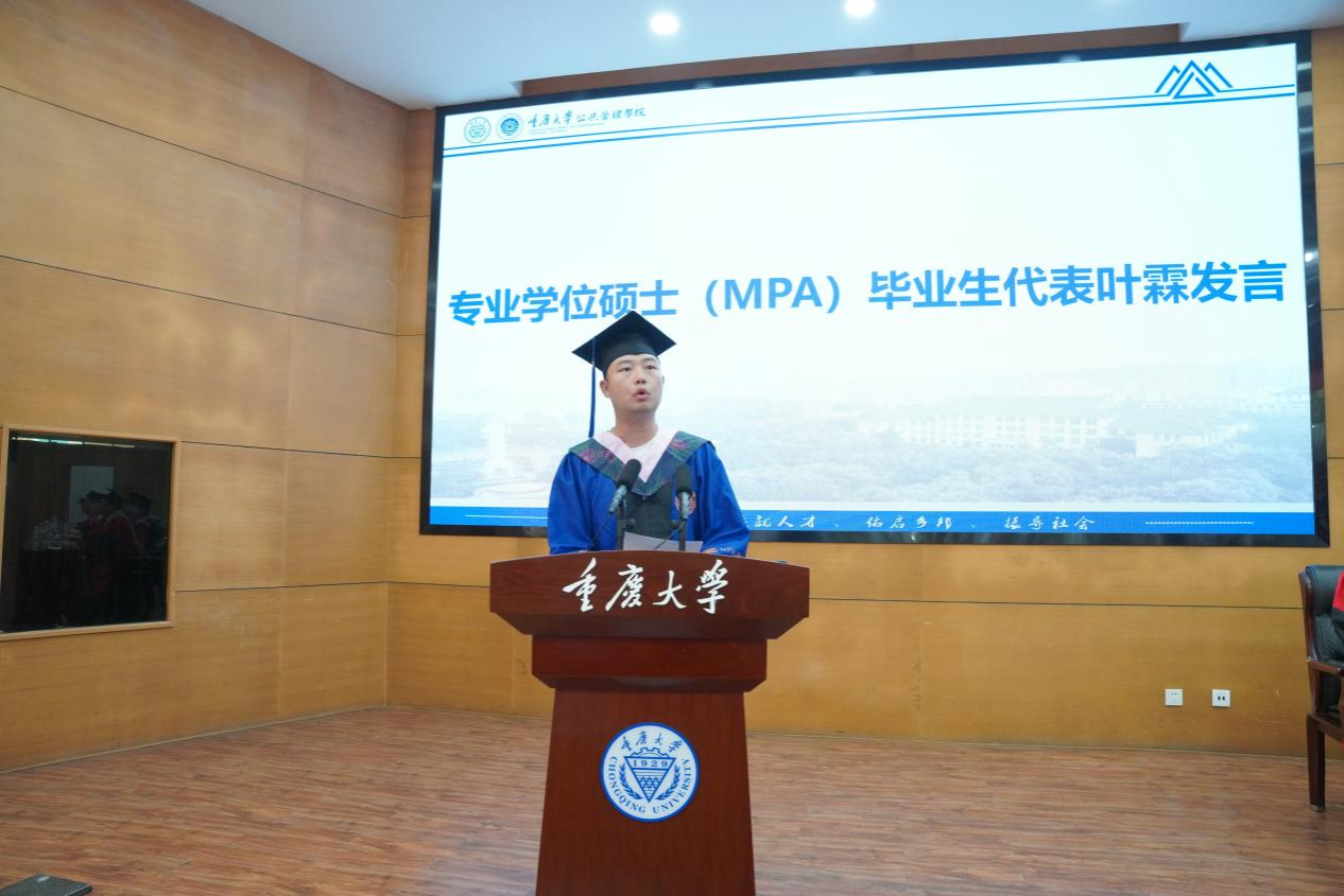 专业学位硕士毕业生代表叶霖发言,他回望了在重大的三年时光,由衷地感恩母校、学院和各位老师,即将带着母校赋予的智慧与力量奔赴四方,以重大人“研究学术,造就人才”的使命为指引,在各自的工作岗位上发光发热,为推动公共管理事业的发展贡献自己的一份力量。
