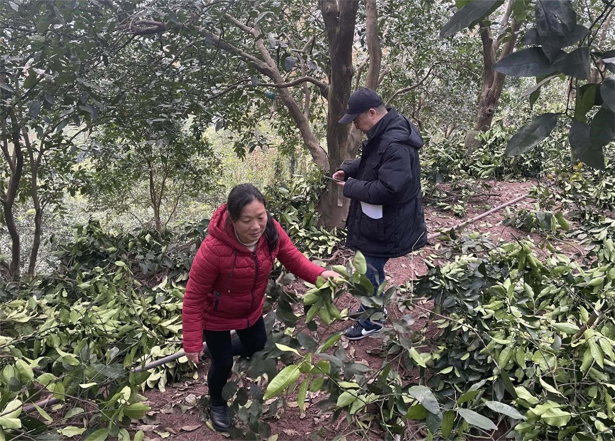 在与村支书及部分村民的座谈与交流后,实践及调研团队深入长寿柚的部分种植现场,实际参与了部分果树的修枝剪叶活动,了解到了长寿柚的病虫害绿色生物防治措施和果园智能化灌溉系统设施,并跟随村民吕群英前往她家的果林参观了百年柚树,实地体验了为长寿柚果树修枝、维护果树健康的艰辛。