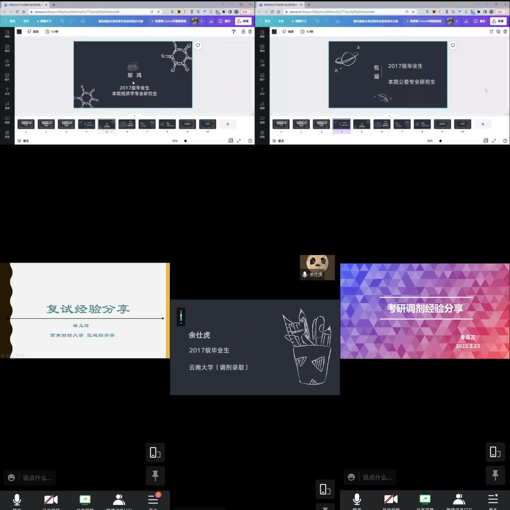 2022-04-07时维三月下旬,全国各院校考研初试分数线陆续公布,复试即将进行。为了帮助学院2022届本科考研学子们更好地准备研究生入学复试,学院邀请了五位2021届和2020届考研成功、有着丰富复试经验的学长学姐为同学们们进行考研复试经验分享,会议于2022年3月23日晚19:30以线上会议方式举行,由在线色情 团委书记、2022届辅导员徐柳老师主持、42名考研学子参会。首先为大家进行分享的是目前在在线色情 2020级产业经济学专业就读的郑鸿学...