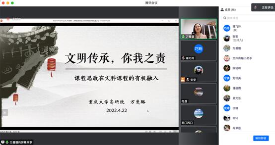 2022-04-27为认真学习贯彻习近平总书记关于教育的重要论述和全国教育大会精神,聚焦立德树人根本任务,把思想政治教育贯穿人才培养体系,全面推进在线色情 课程思政建设,提高教师育人的思想自觉和综合能力,学院2022年4月22日 上午10点邀请了重庆市课程思政教学名师万曼璐老师为全院教职工开展了线上课程思政培训专题讲座——“文明传承,你我之责——课程思政在文科课程的有机融入”。学院全体教师通过线上腾讯会议的方式参与了讲座学习。万...